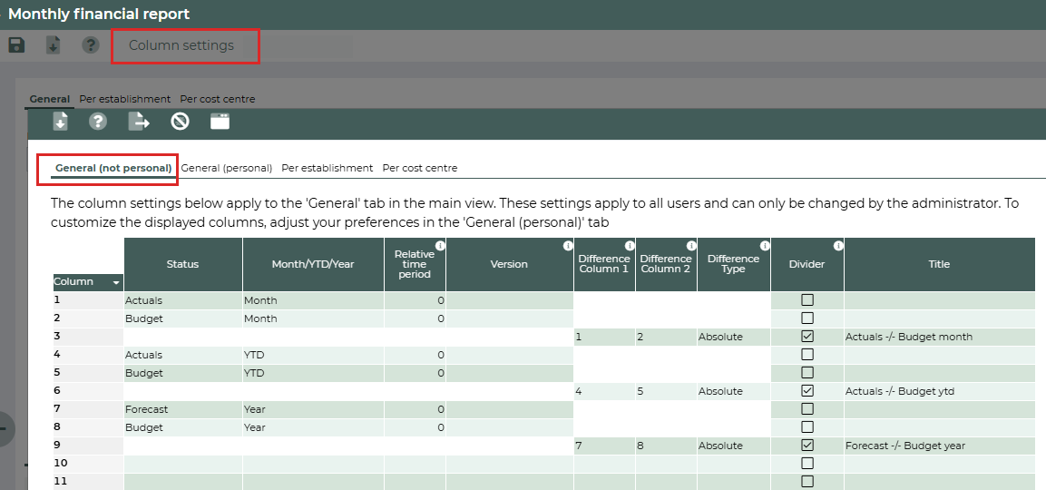 - In the Relative time period column, you can specify which month, year or YTD level you want to display. If you enter 0, you indicate that you want to display the current month, YTD up to and including the current month and the current year.