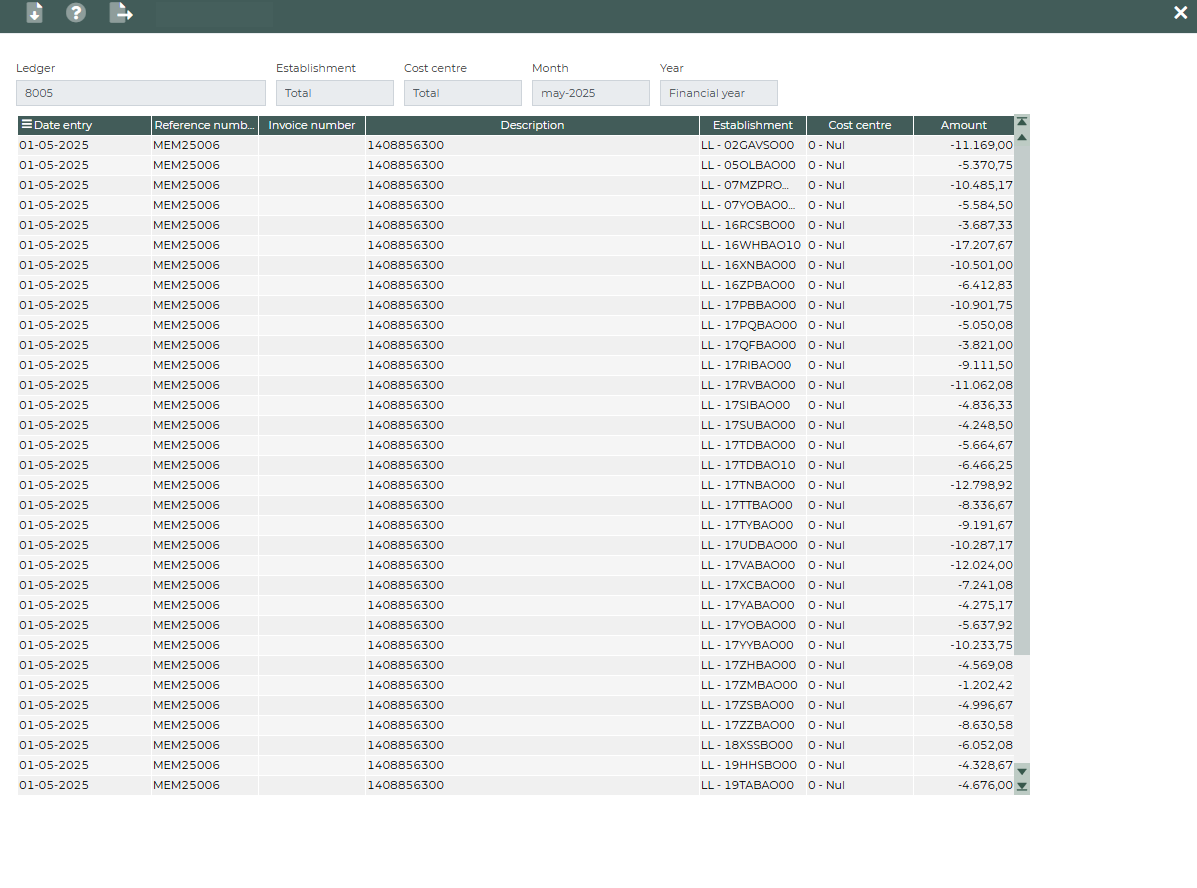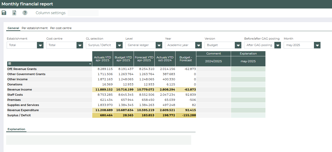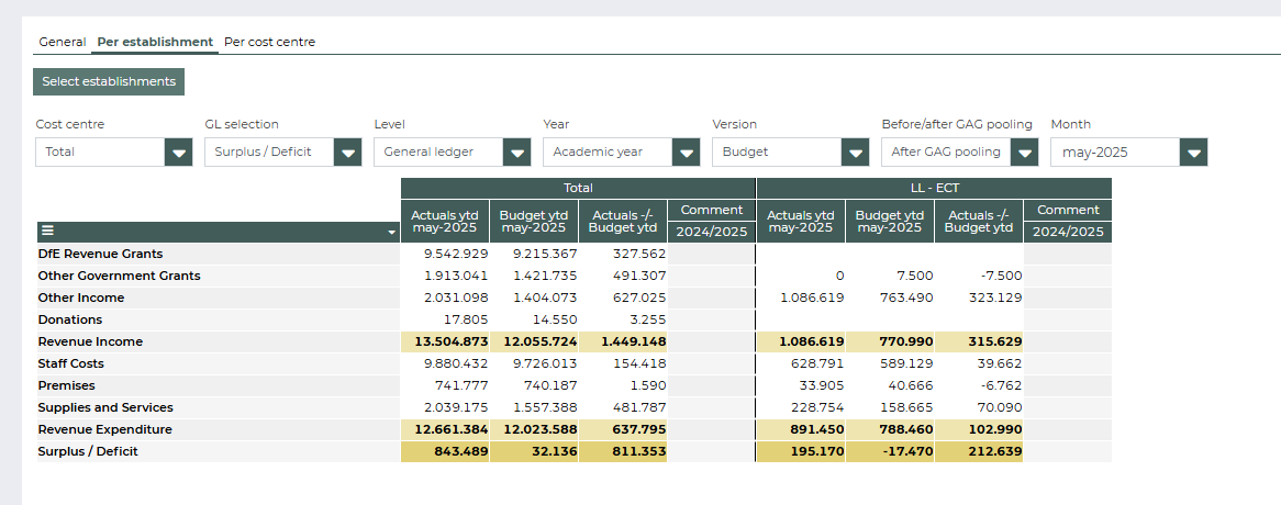 This tab displays the monthly financial report per ledger group. By changing the Level filter, you can also display the ledgers. On this tab, you can filter by establishment or cost center.