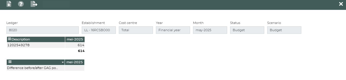 In the Forecast/Budget column, you can click through to the budget line if it was entered in the Other income and expenditure view. This is done by clicking on the amount on the ledger in the main view and then clicking on the amount in the second view that opens. This view opens as follows if there is no mapping by cost centre: