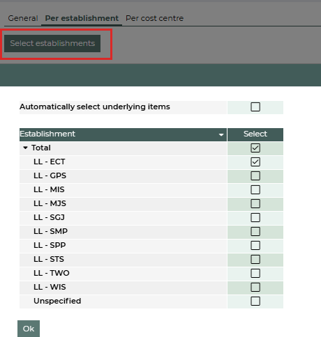 Click on Select establishments to select the establishments you want to display beside each other. There is a limitation based on the authorisation settings. You only see the establishments you are authorised to see. For example: