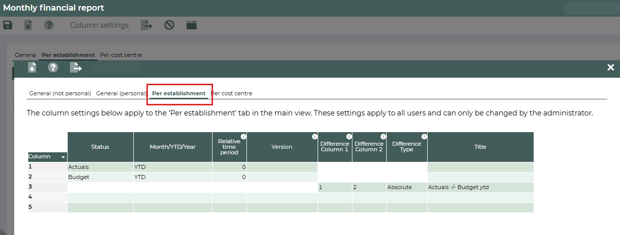 The administrator can personalise the tab Per establishment via the Column settings. This works in the same way as described in the Column settings section. For example: