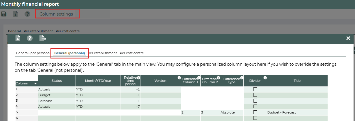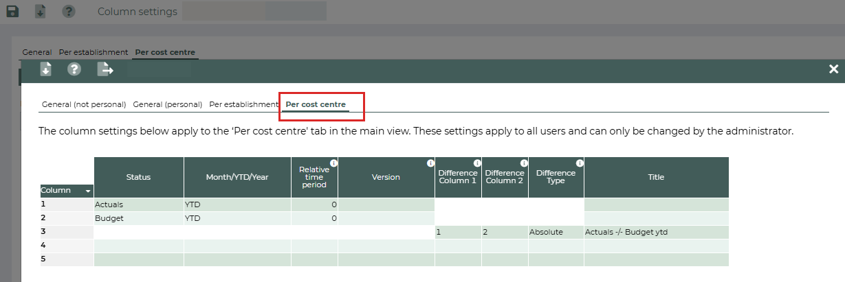 The administrator can personalise the Per cost centre tab as needed in the Column settings. This works in the same way as described in the Column settings section. For example: