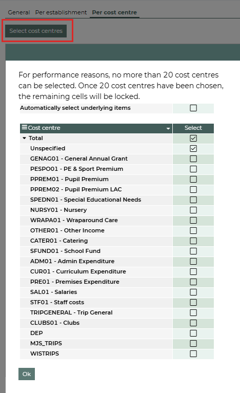 Click on Select cost centres to select the cost centres you want to display beside each other. You can select a maximum of 20 cost centres. Selecting more would affect the performance. For example: