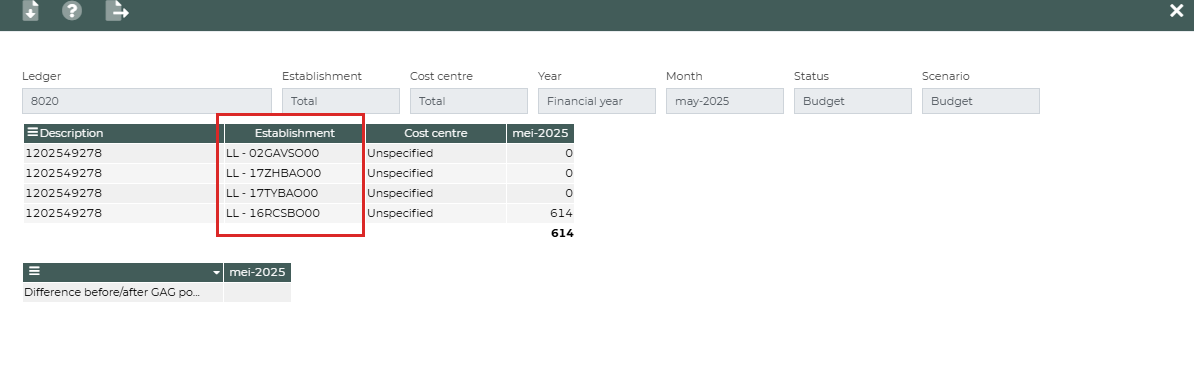 The above examples are at the lowest establishment level. If you click on a higher level, you will see a breakdown by budget line and establishment: