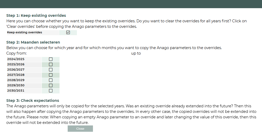 Parameters are copied to the overrides only for the selected years.