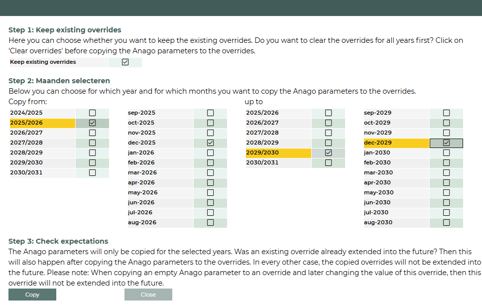 Step 2: Specify start and end (year and) months, of the range for which you want to copy the parameters.