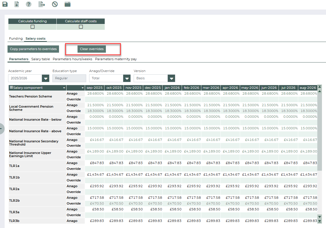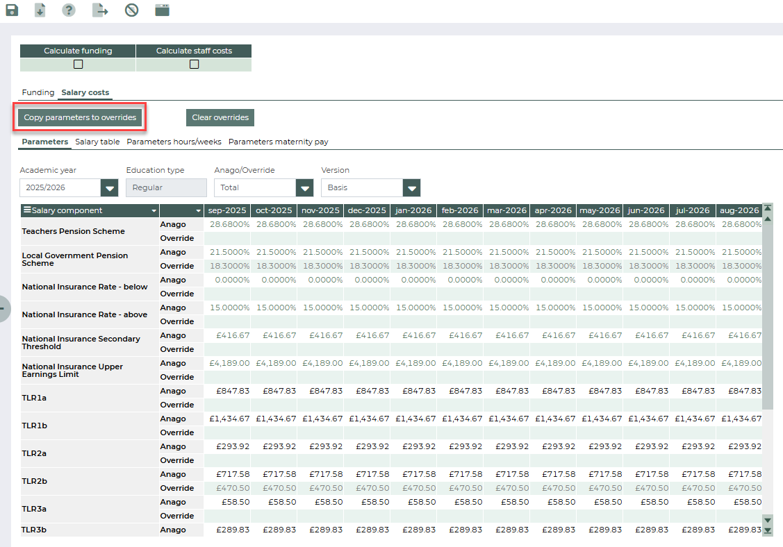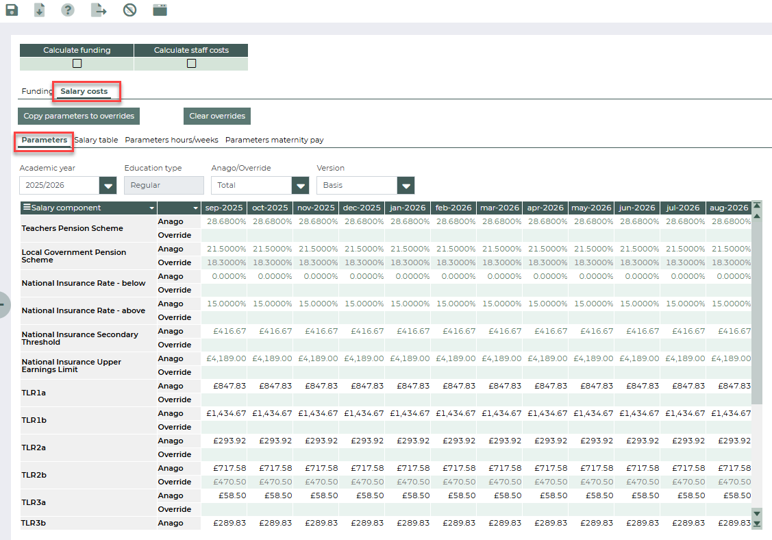 In this tab, the parameters for the salary components can be managed per month and per education type. They can be percentages or amounts in £, and are used in salary cost calculations in other views. The parameters are defined per academic year and education type, which you can change using the filters above the table.