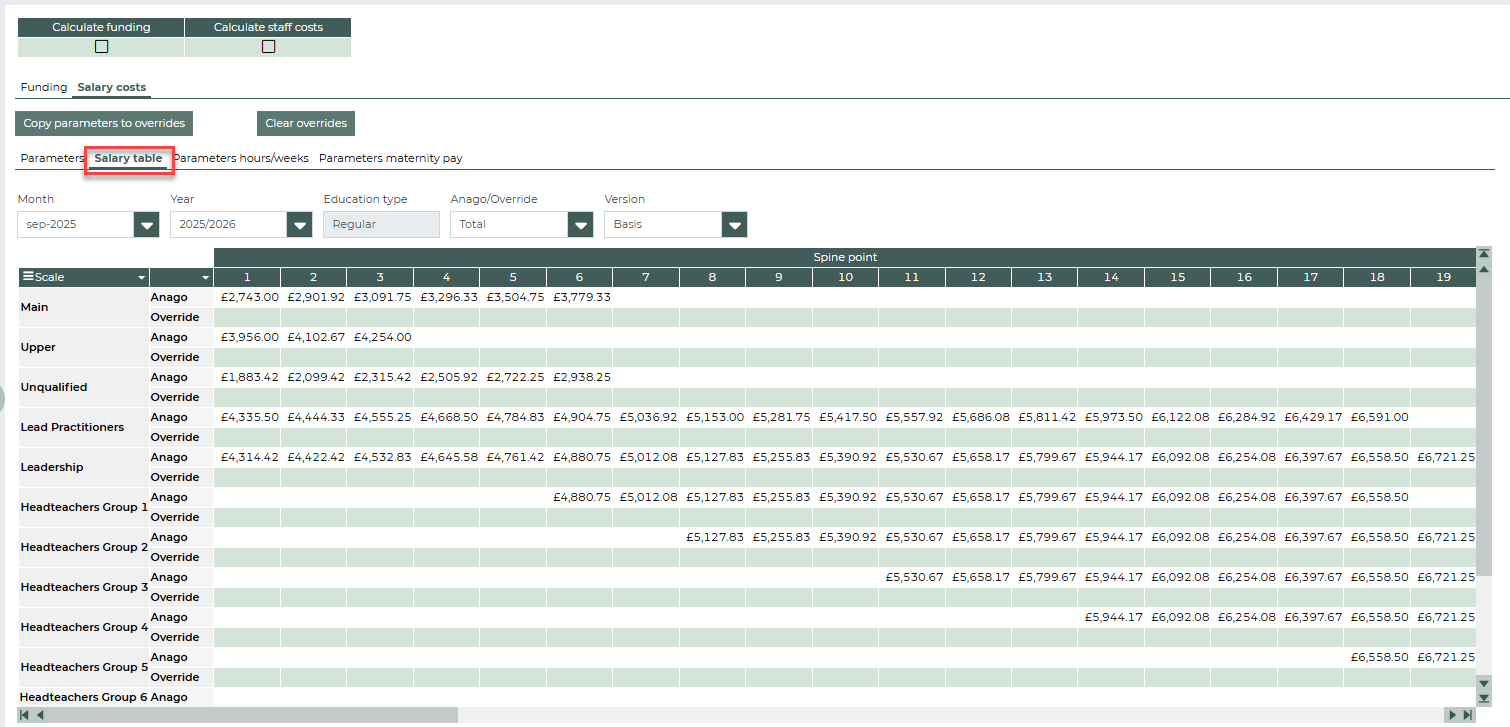 The Salary table tab displays the amounts per scale and periodic per education type. Here too, you can enter overrides. With the Anago/Override filter, you can only display the rows with Anago parameters or Override parameters.