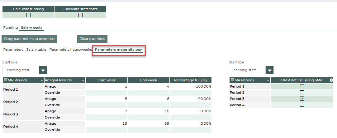 In the override you can chance the parameter. Once the view has been saved, future calculations will be performed with these override parameters. Once the parameters have been changed, the salary costs are calculated by ticking Calculate salary costs and saving the view. Here too, no users other than the administrator should be logged in to the system when calculations are running. Please note that if you enter an override, the amounts will no longer correspond to the current collective bargaining agreement. see for more information this article: