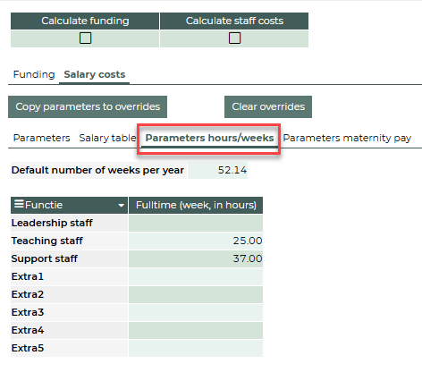 The parameters hours/weeks tab displays the fulltime working hours per week. You can change this for your company. Once you change this parameter and save the information, the salary costs will change.