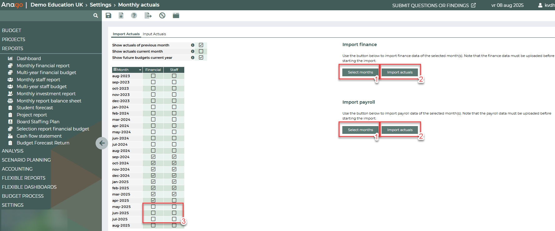 In the monthly financial report, you can only select the imported actuals up to and including the month of May.