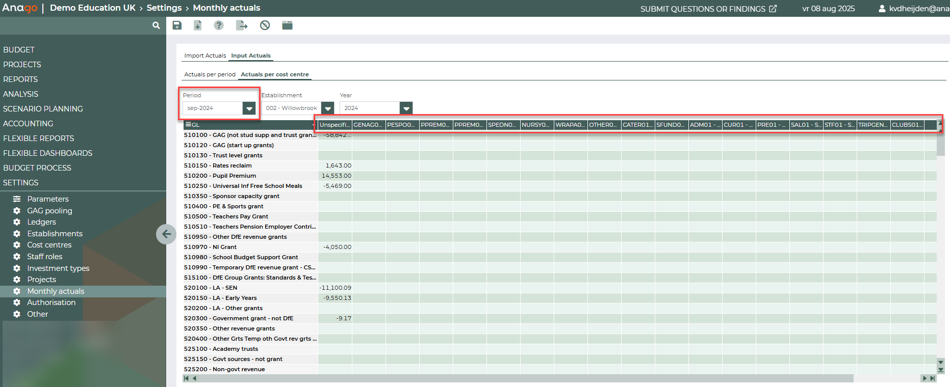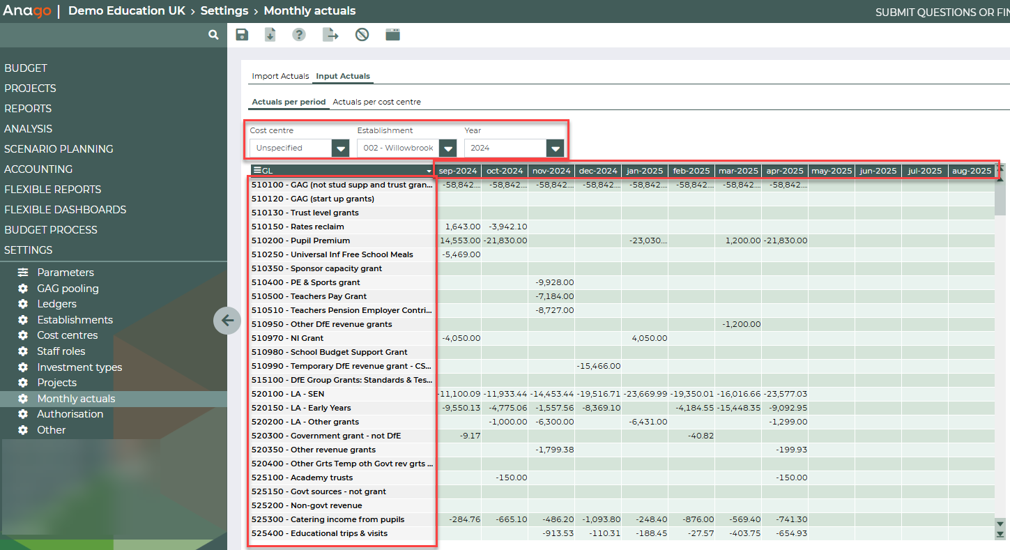 Within this tab, you can filter by Cost Centre, Establishment, and Year. Input can be provided for multiple ledgers and months at once, simply by entering or pasting the actuals and saving the view.