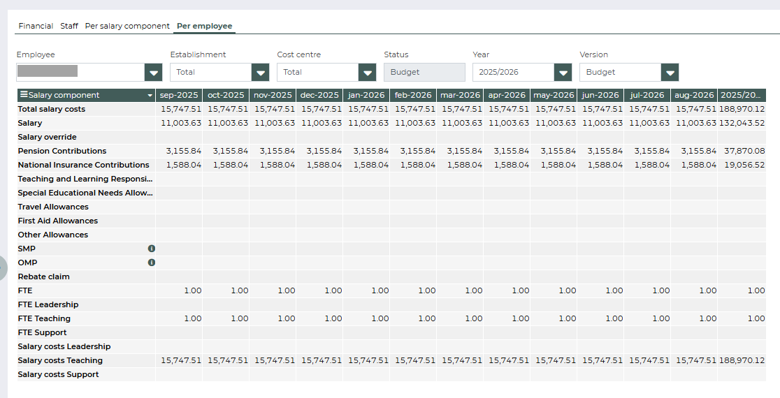 This tab displays the salary costs per employee. In this view, the salary costs are broken down per salary component.