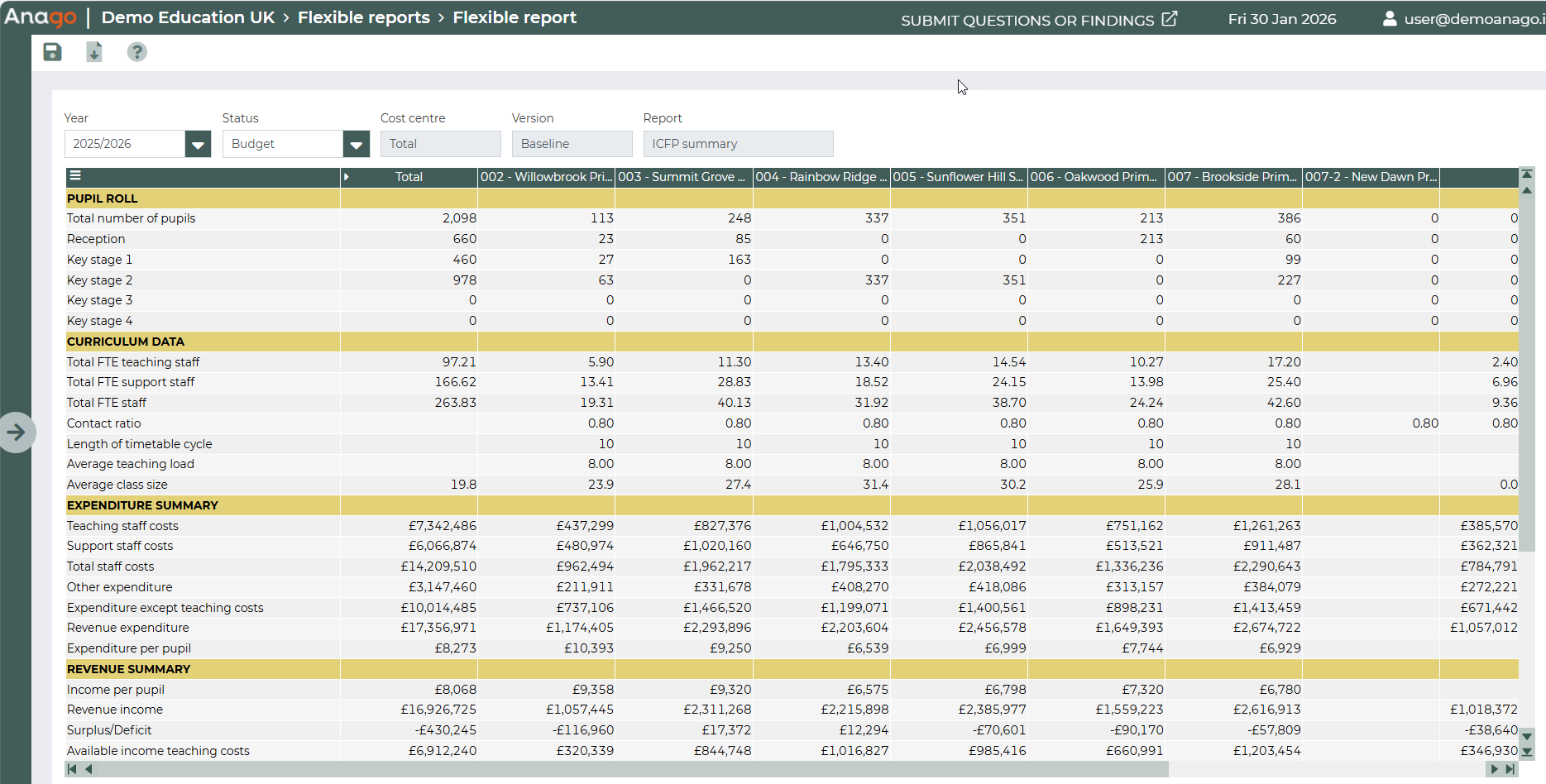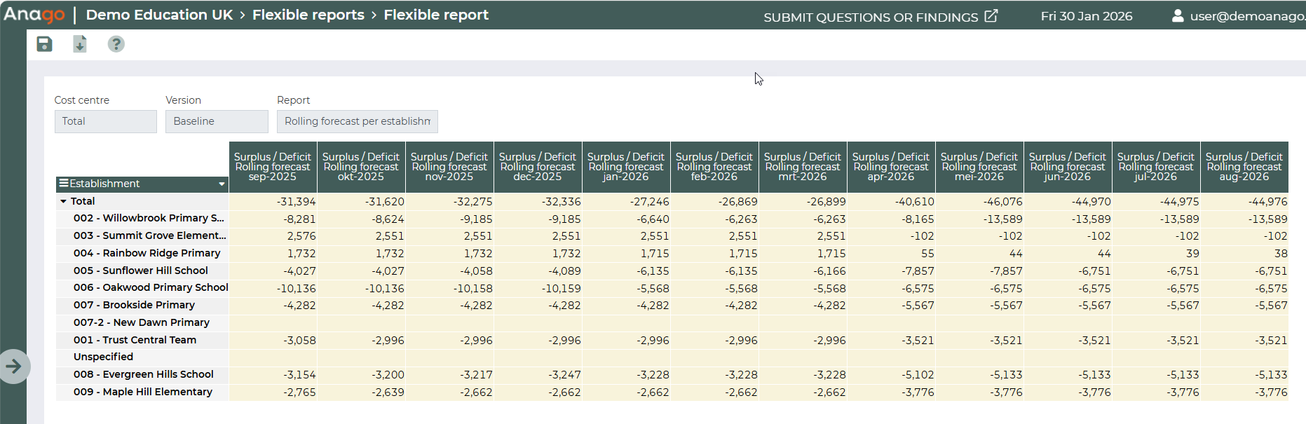 - A report with report facts in the rows and establishments or cost centres in the columns. This report provides a one-year side-by-side overview of all of the establishments or cost centres for the selected report facts.