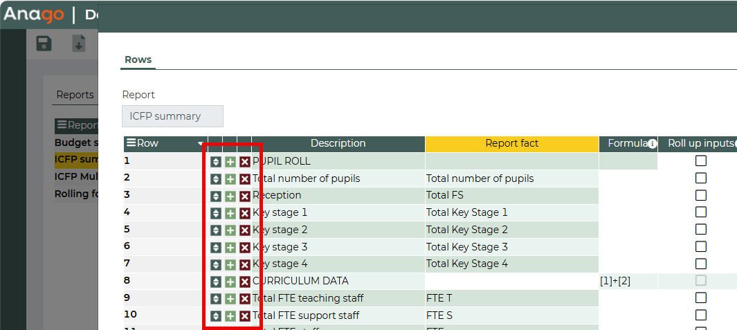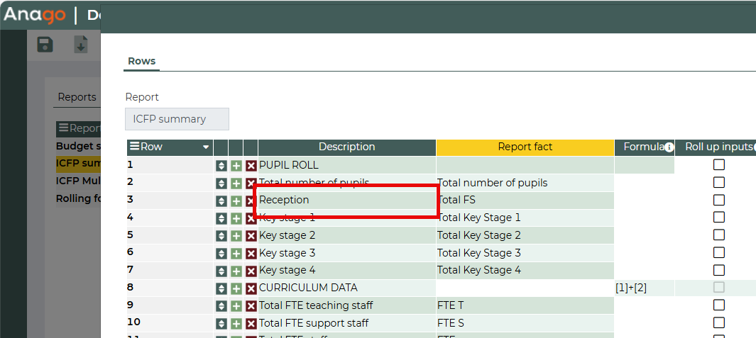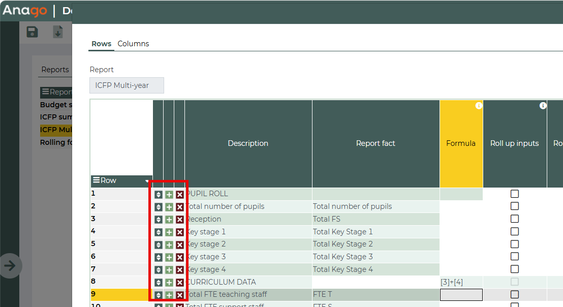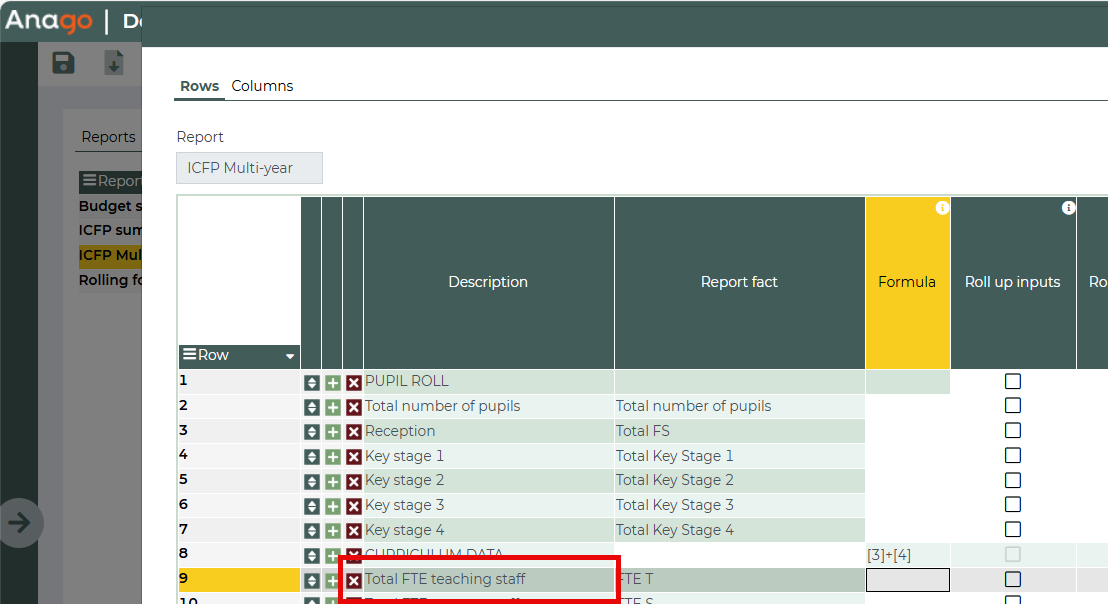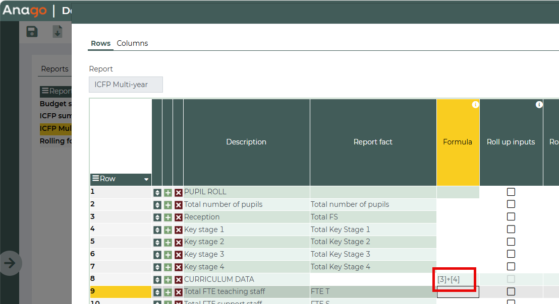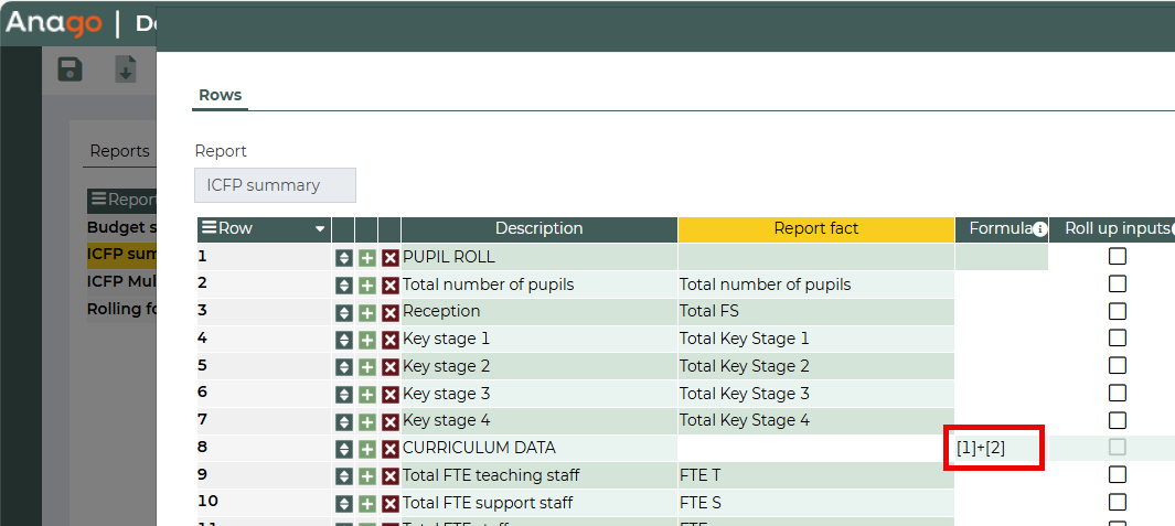 Click in the Report facts column to select the report facts you would like to display in the report. You can choose from funding facts, GL accounts, consolidations, number of pupils, salary components, FTEs, salary costs, depreciations, book values and the purchase values of investments. - You can add a formula to your report in the Formula column. Rows are referenced by entering the row number in square brackets as follows:
