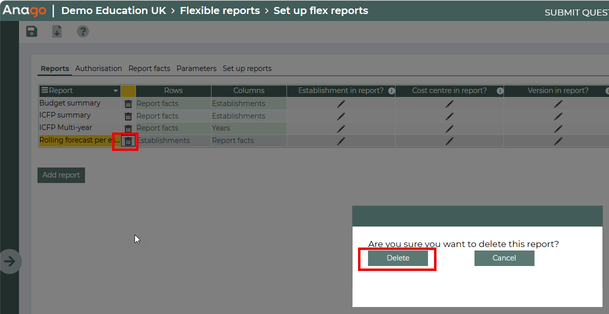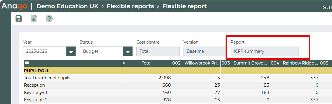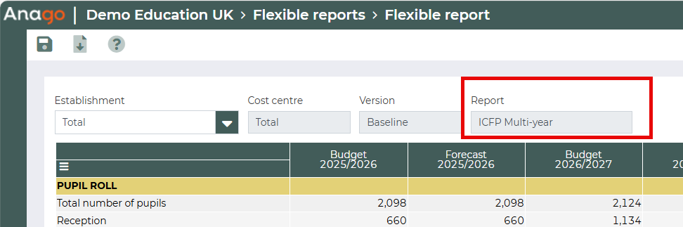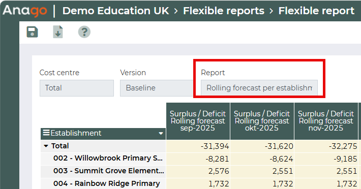 - Use the pencils to select the establishments, cost centres and versions that can be selected from the report filters.