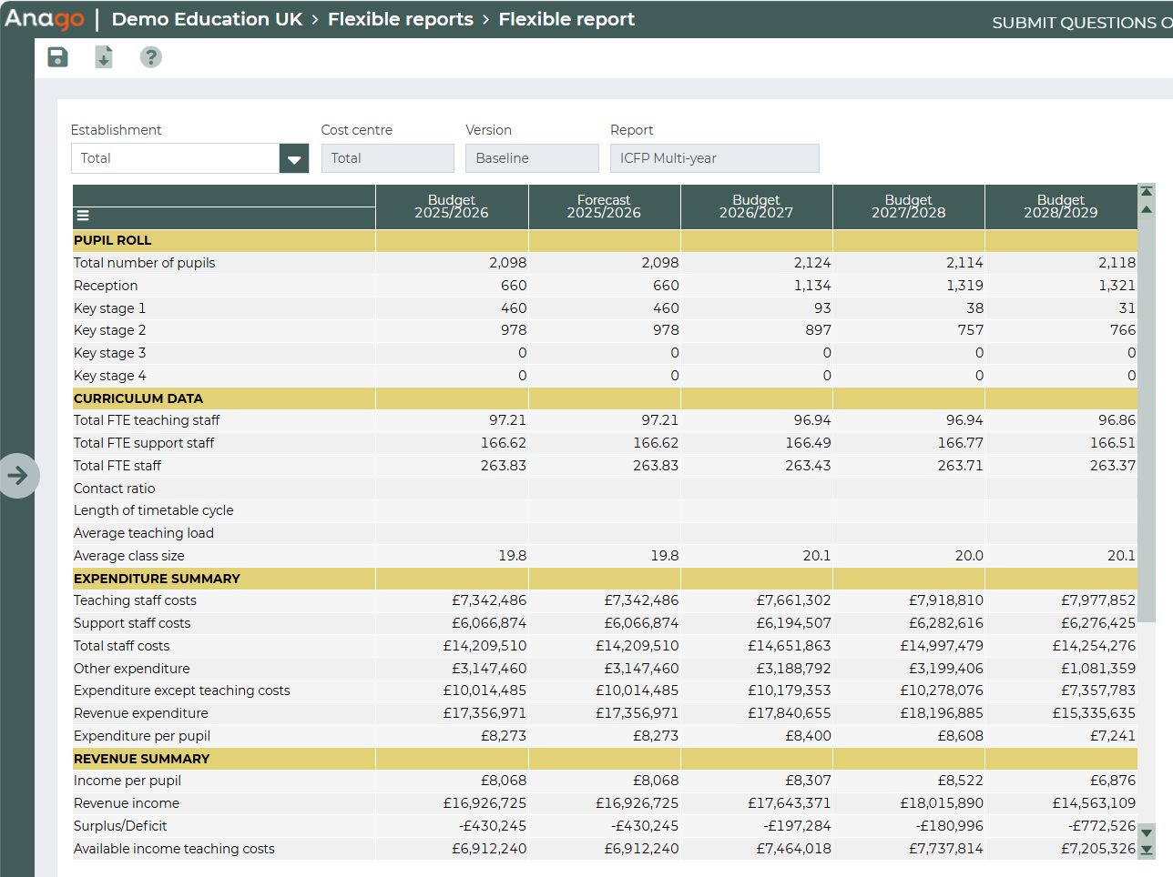 - A report with report facts in the rows and the years/statuses in the columns. This report provides an overview of facts per year and status for one establishment. By status, we mean the budget, forecast or actuals.