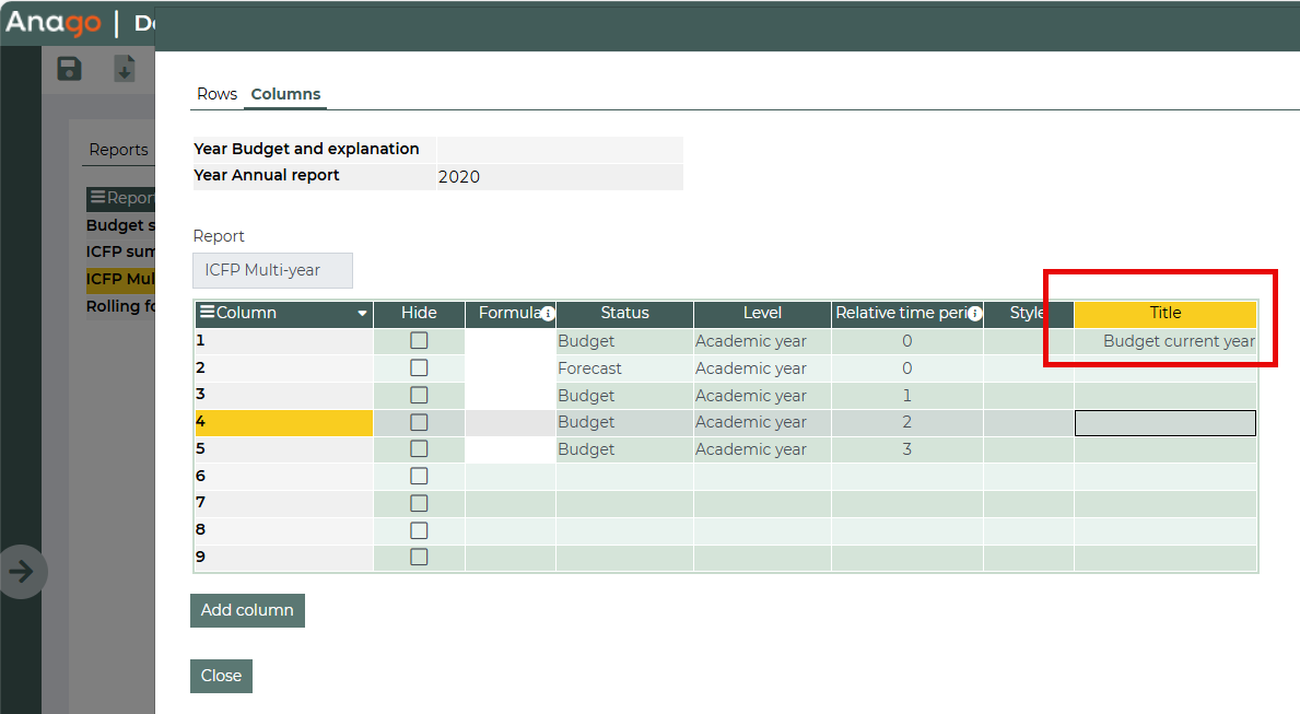 - In the same view, go to the Columns tab. Click in the Status column to select the statuses you want to display. You can choose from Budget, Forecast, Actuals, and Rolling forecast.