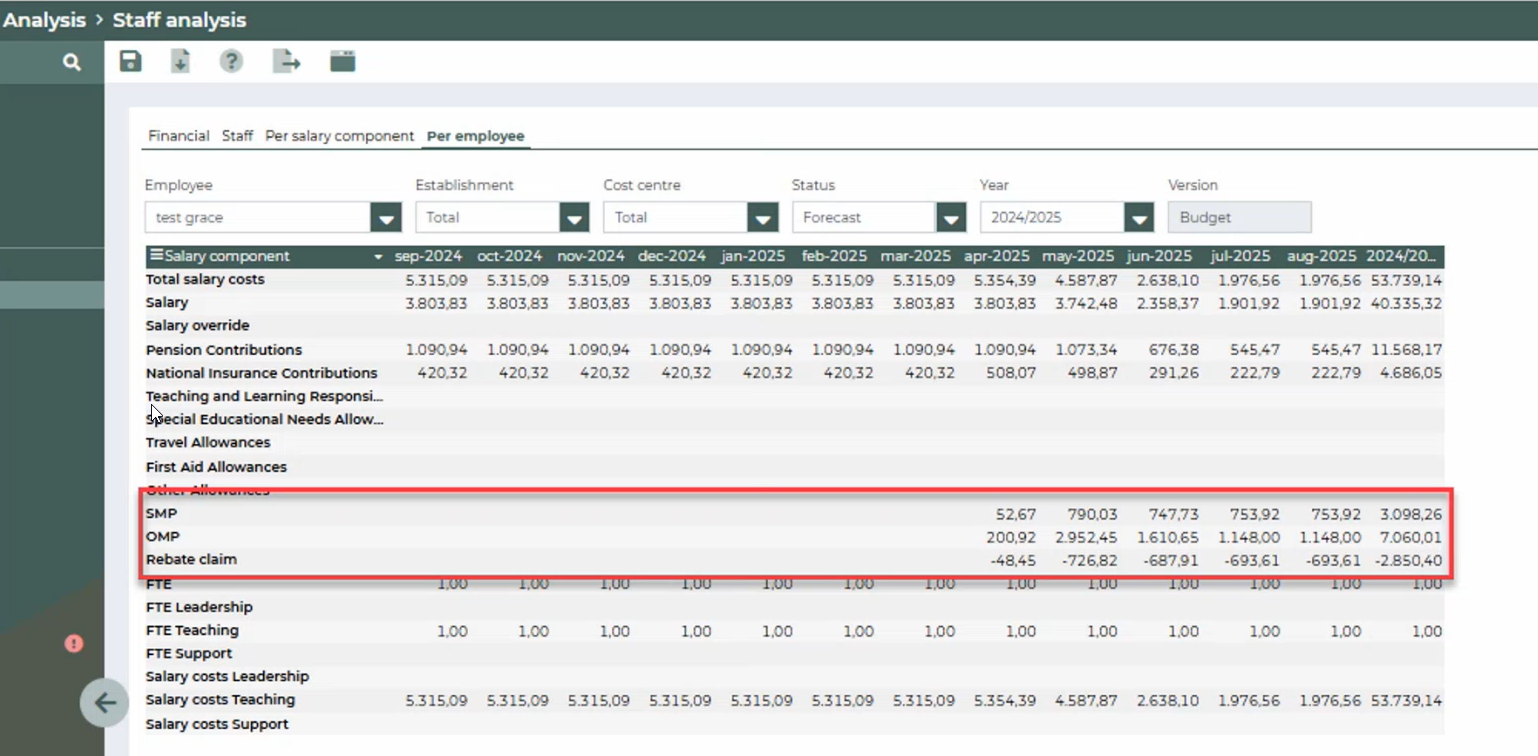 In the staff analysis in the tab "per employee" you can find the amounts of the maternity pay. Also you can find the amount of the rebate claim.