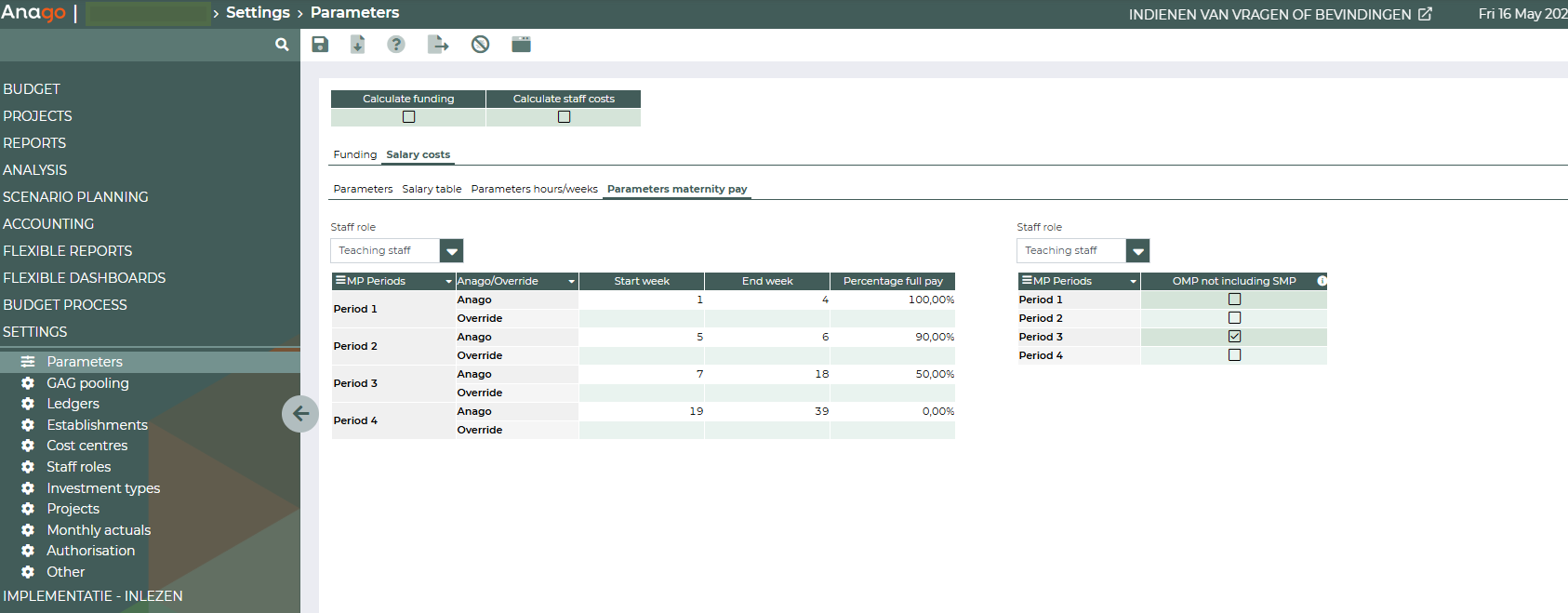 In this tab the parameters, in the Anago row, for the starting weeks, ending weeks & percentage full pay can be managed. If you’d like to use other values, you must enter them in the Override row below it.