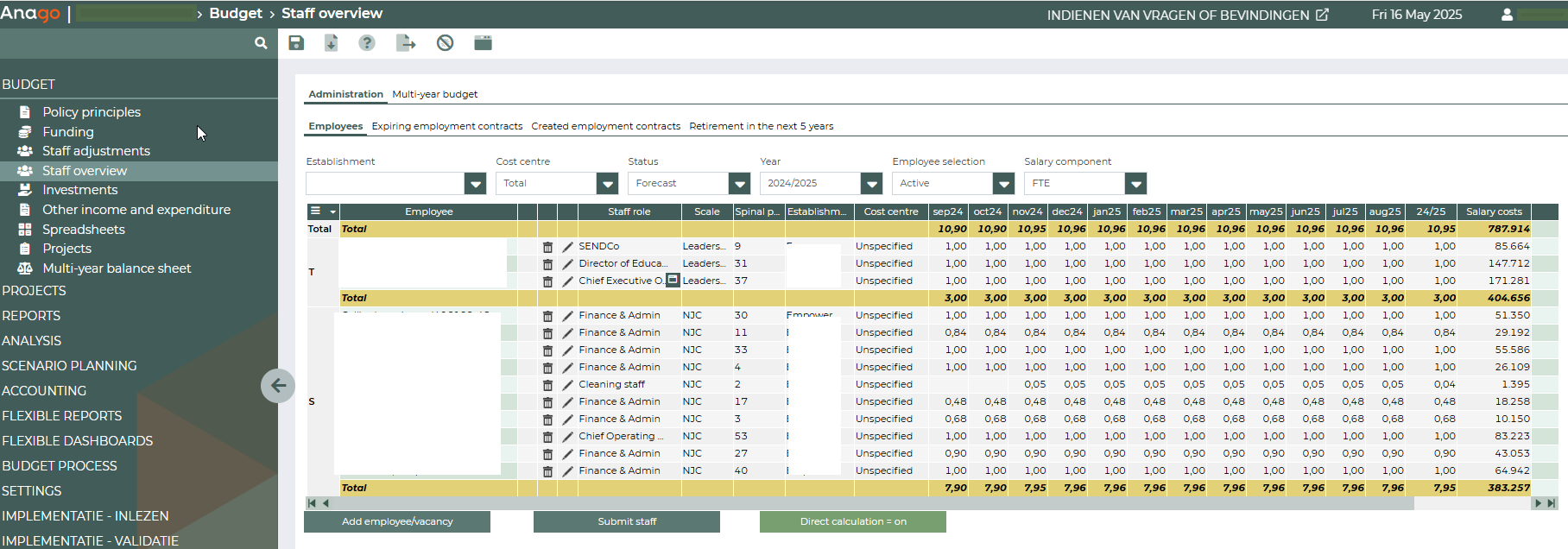 Once the parameters for OMP have been changed, the salary costs are calculated by ticking Calculate salary costs and saving the view. Saving the view calculates the salary model with the new parameters. No users other than the functional manager should be logged in to the system when calculations are running.