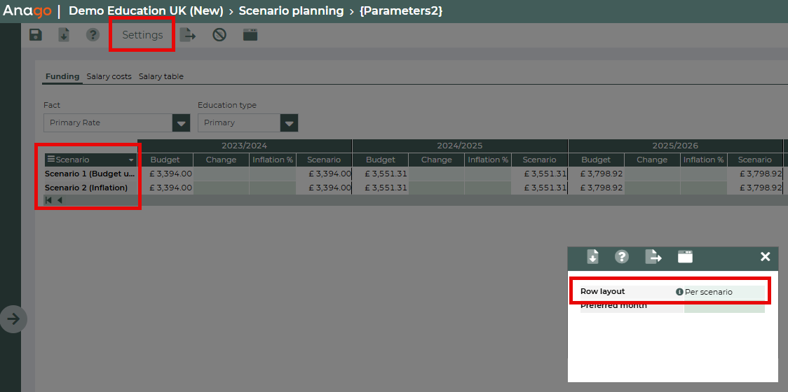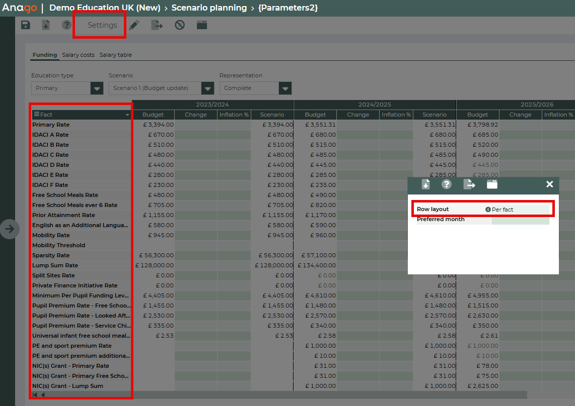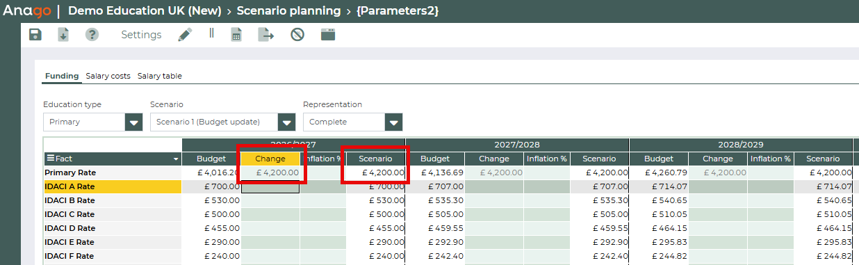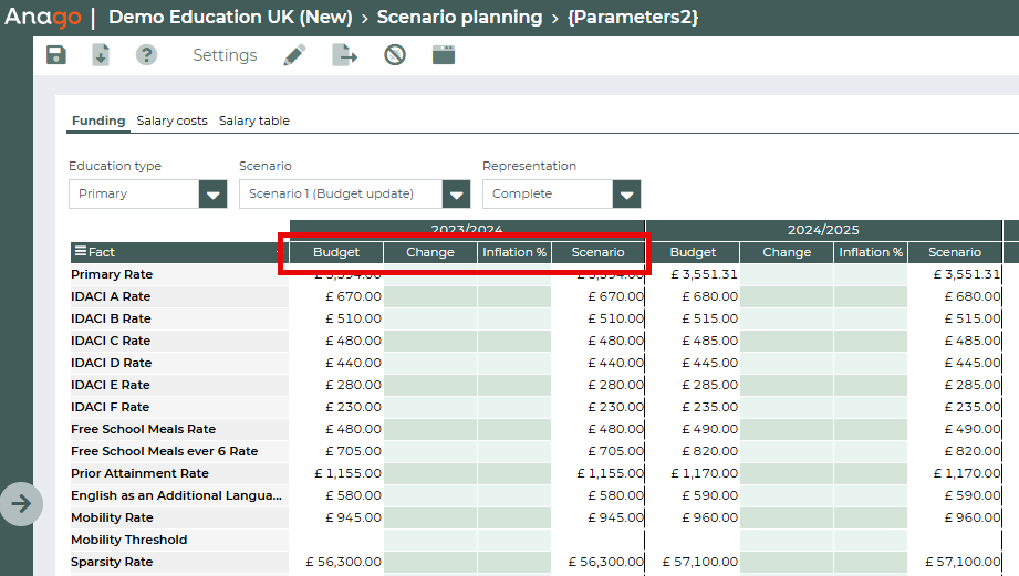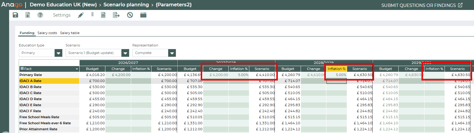 The Parameters view is where you adjust the assumptions used within a scenario. These parameters determine how calculations are carried out for funding and staffing.