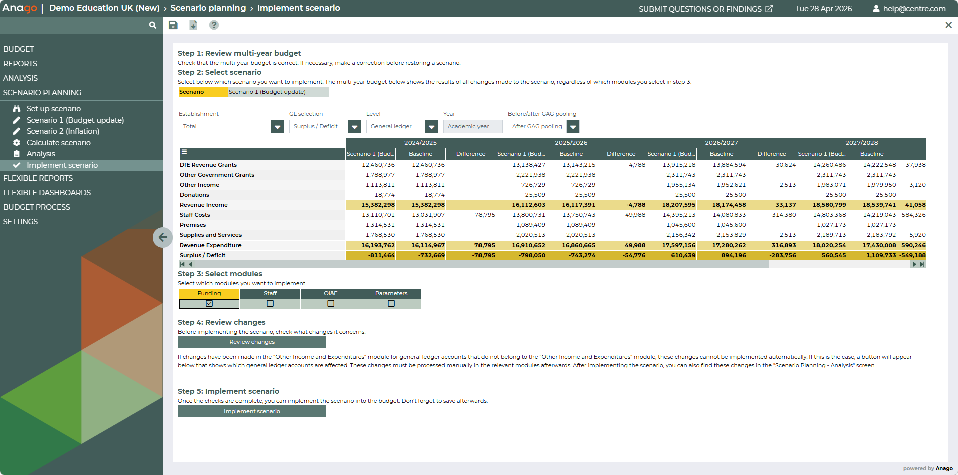 - Implement: to permanently transfer the changes from a scenario into the budget