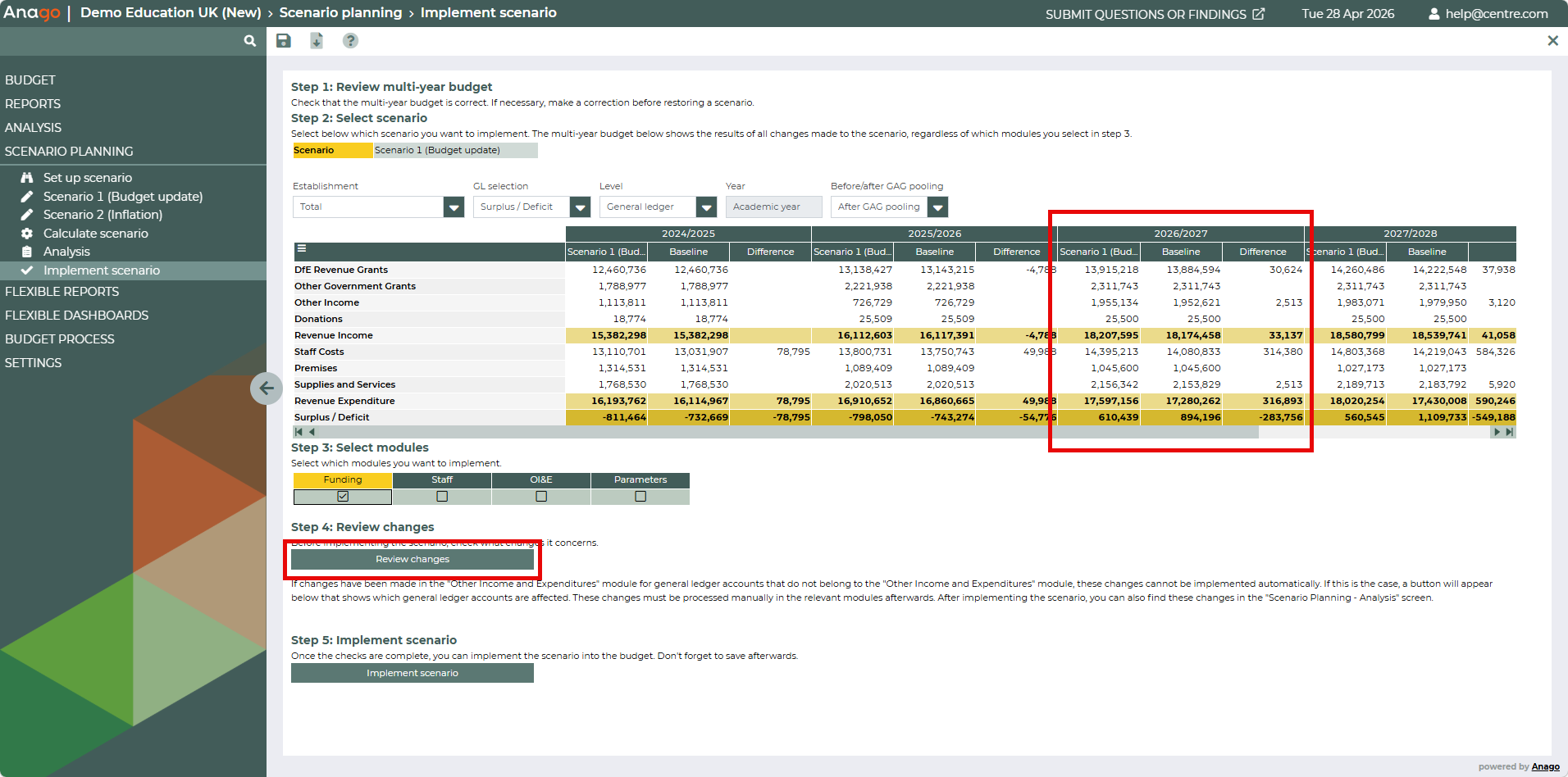 Shows a comparison between the scenario and the budget, and the Review changes button.