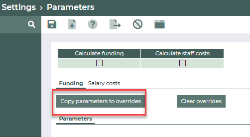 NOTE: Do this for all pages (Funding -> Parameters; Salary costs -> Parameters; Salary costs -> Scale parameters; Salary costs -> Salary table).