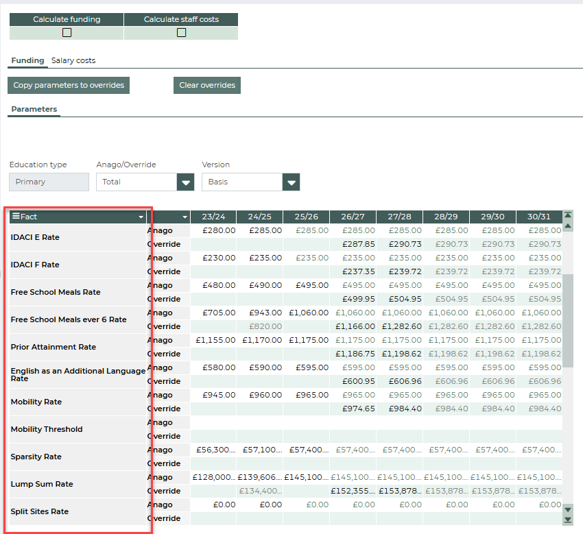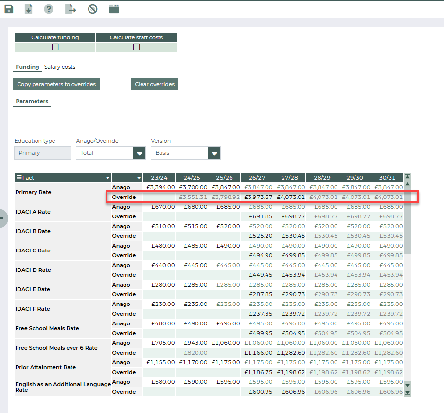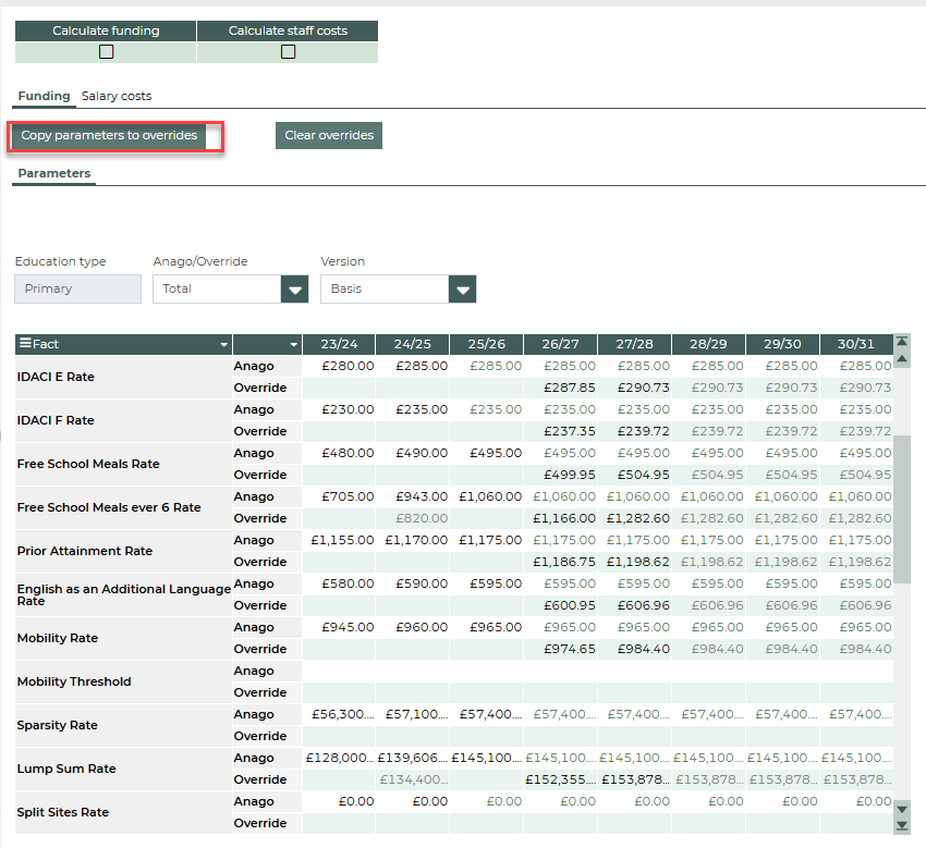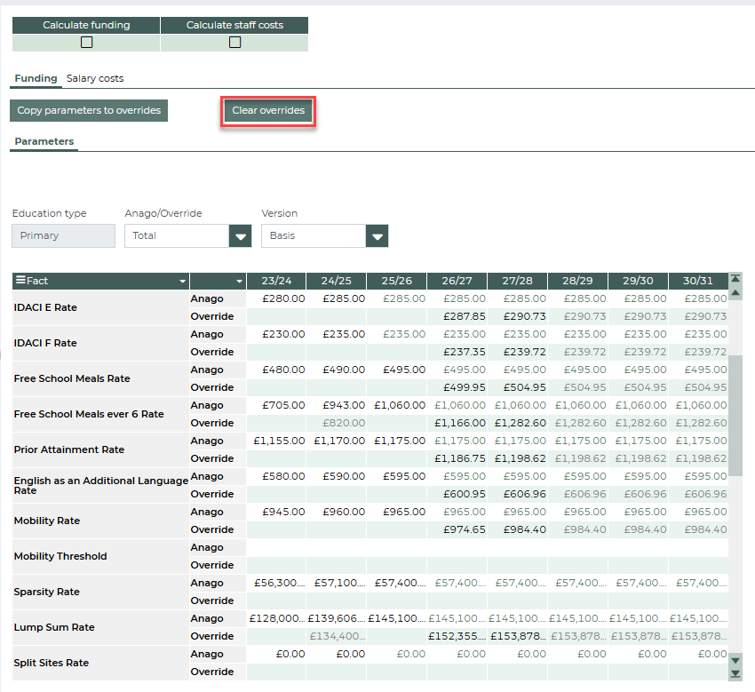 Changes that are based on an override must always be made in the financial year column, including changes to the funding by school year. All of the underlying columns are automatically populated with the values in the override.