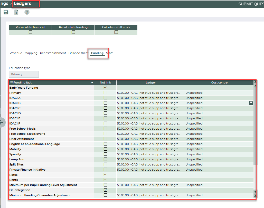 You must then link these facts to a ledger. To do this, go to the view "Ledgers", Funding tab, and link the fact per education type to a ledger that is linked to the Funding module on the Operations tab.