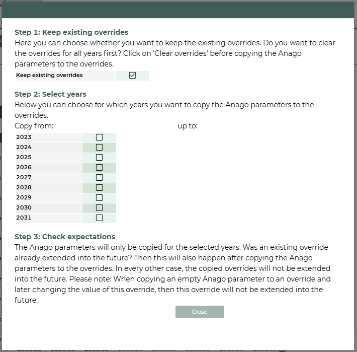 Step 2: Specify the year range from which to which you want to copy the parameters.
