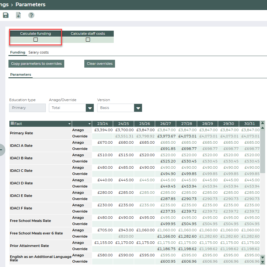After the funding parameters have been updated, recalculate the funding by selecting Calculate funding and saving the view.