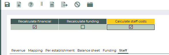If you made changes in this view, Recalculate financials and Recalculate staff costs must be ticked. This process can take a while.