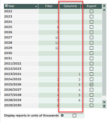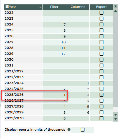On this tab, in the Filter column, use a number to indicate which financial/academic years are shown in the filters on the entry and reporting views. By default, the views open with the year labelled 1.