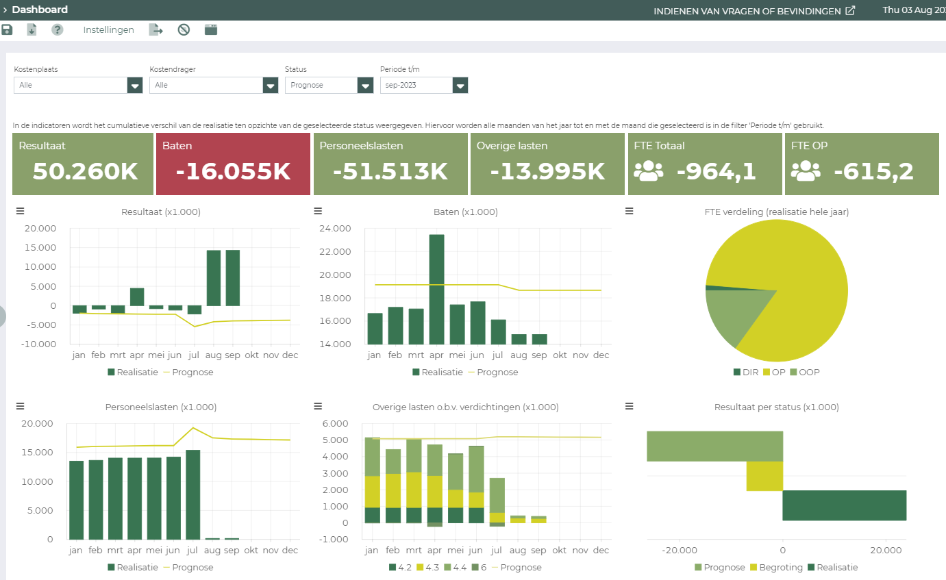 Het dashboard toont, afhankelijk van je autorisatie en selectie, in één oogopslag of je financiële positie goed of slecht is. Dit is slechts een indicatie. Door in te zoomen op bepaalde velden kun je een uitgebreidere analyse maken. Klik hiervoor op een gekleurd veld of op een kolom in een grafiek.