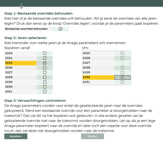 De Anago parameters worden voor enkel de geselecteerde jaren naar de overrides gekopieerd. Werd een bestaande override voor een parameter al doorgetrokken naar de toekomst? Dan zal dit na het kopiëren ook gebeuren. In alle andere gevallen zal de gekopieerde override niet naar de toekomst worden doorgetrokken. Let op: als je een lege Anago parameter kopieert naar de override en later toch een waarde voor deze override invult, dan zal deze niet doorgetrokken worden naar de toekomst.