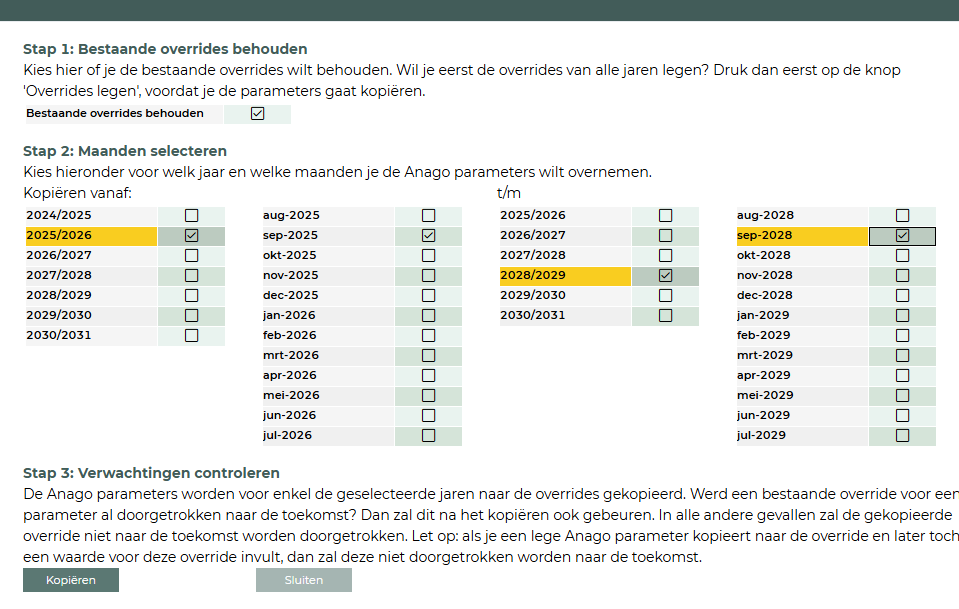 De applicatie kopieert dan voor de aangegeven jaren de overrides in de parameters. Het proces is ook volledig beschreven in de te volgen stappen in de applicatie.