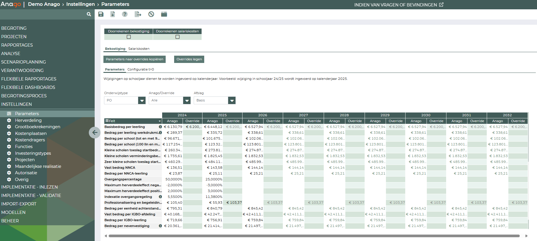 Voor de berekening van de bekostiging en de salariskosten maakt Anago gebruik van een bekostigings- en salarismodel. Deze modellen worden gevuld op basis van wet- en regelgeving. Je hebt de mogelijkheid om bestuursspecifieke bedragen of de wettelijke bedragen aan te passen.