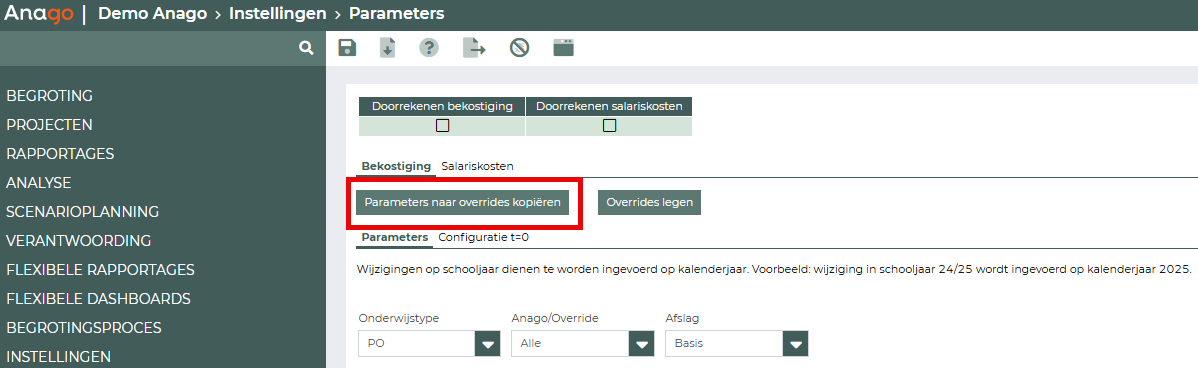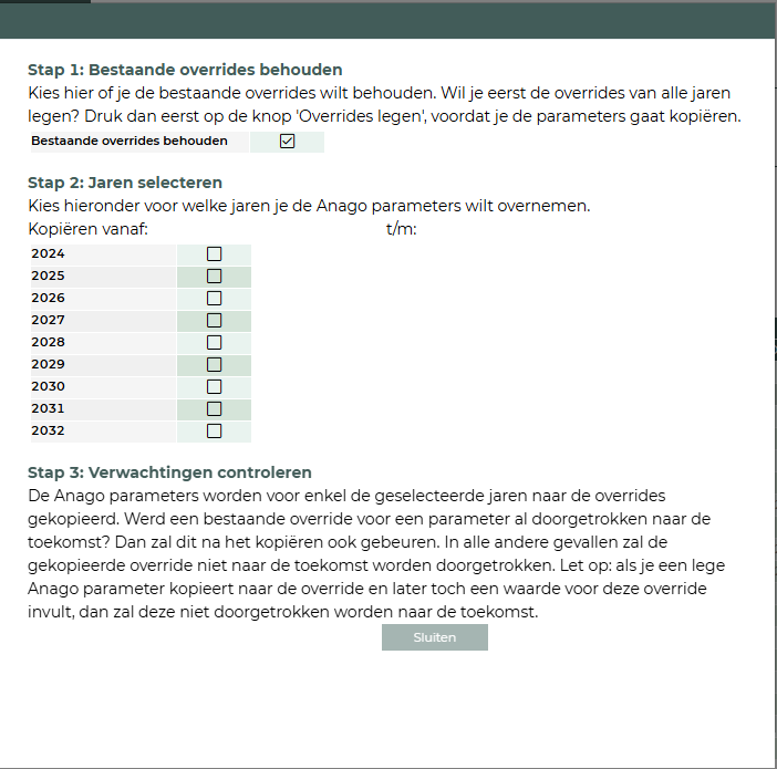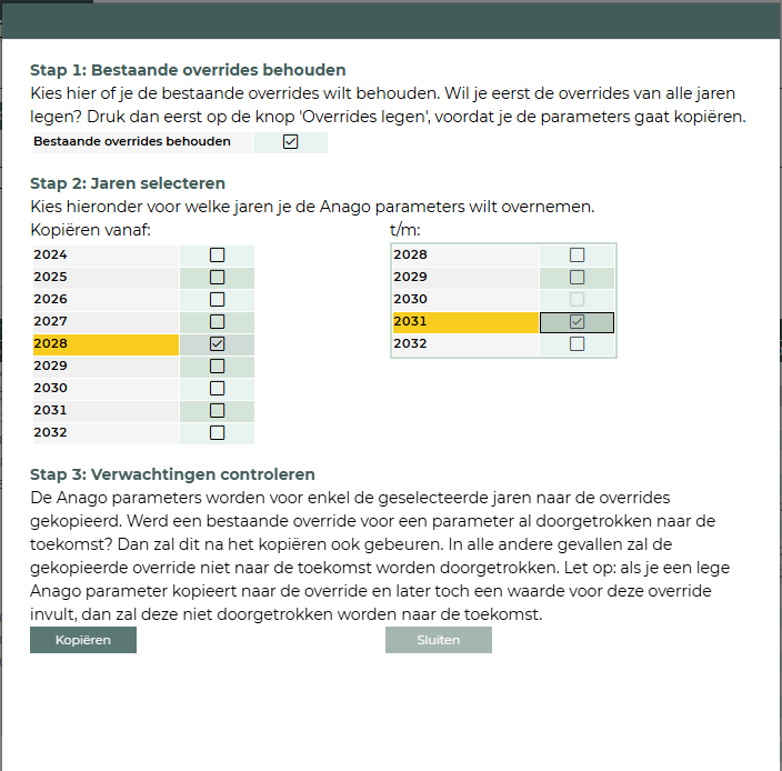 De Anago-parameters worden alleen voor de geselecteerde jaren naar de overrides gekopieerd.