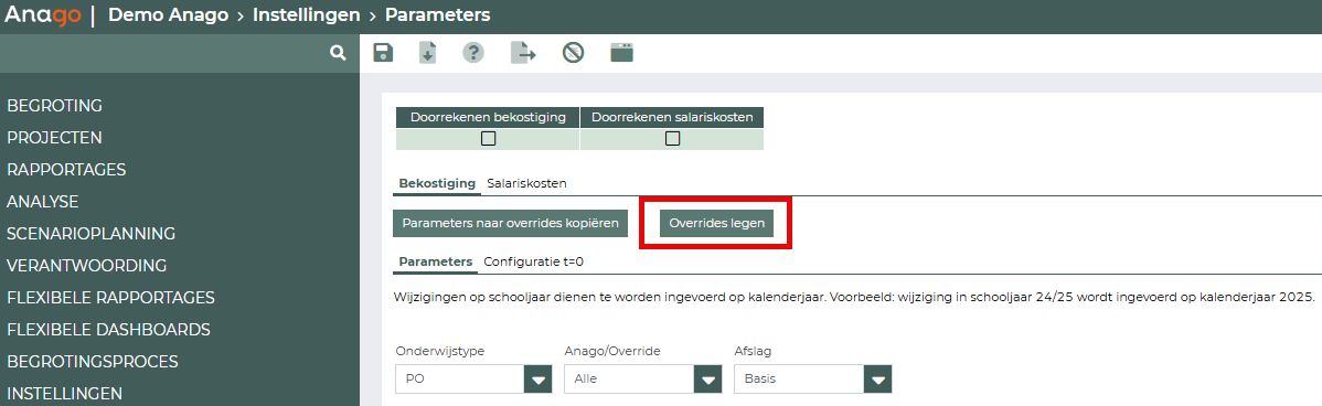 Let op: als je een lege Anago parameter kopieert naar de override en later toch een waarde voor deze override invult, dan zal deze niet doorgetrokken worden naar de toekomst. Met de delete knop kun je deze "harde" waarde weer verwijderen zodat deze weer automatisch wordt doorgetrokken.