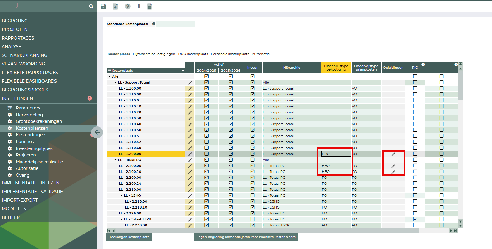 Indien je gebruik maakt van de extra module studentenprognose wordt er in de kolom opleiding een potlood zichtbaar als je bij onderwijtype bekostiging MBO of HBO in hebt gevuld. Als je op het potloodje klikt worden alle actieve opleidingen zichtbaar en kan je deze als deze actueel zijn voor de kostenplaats selecteren door deze aan te vinken.