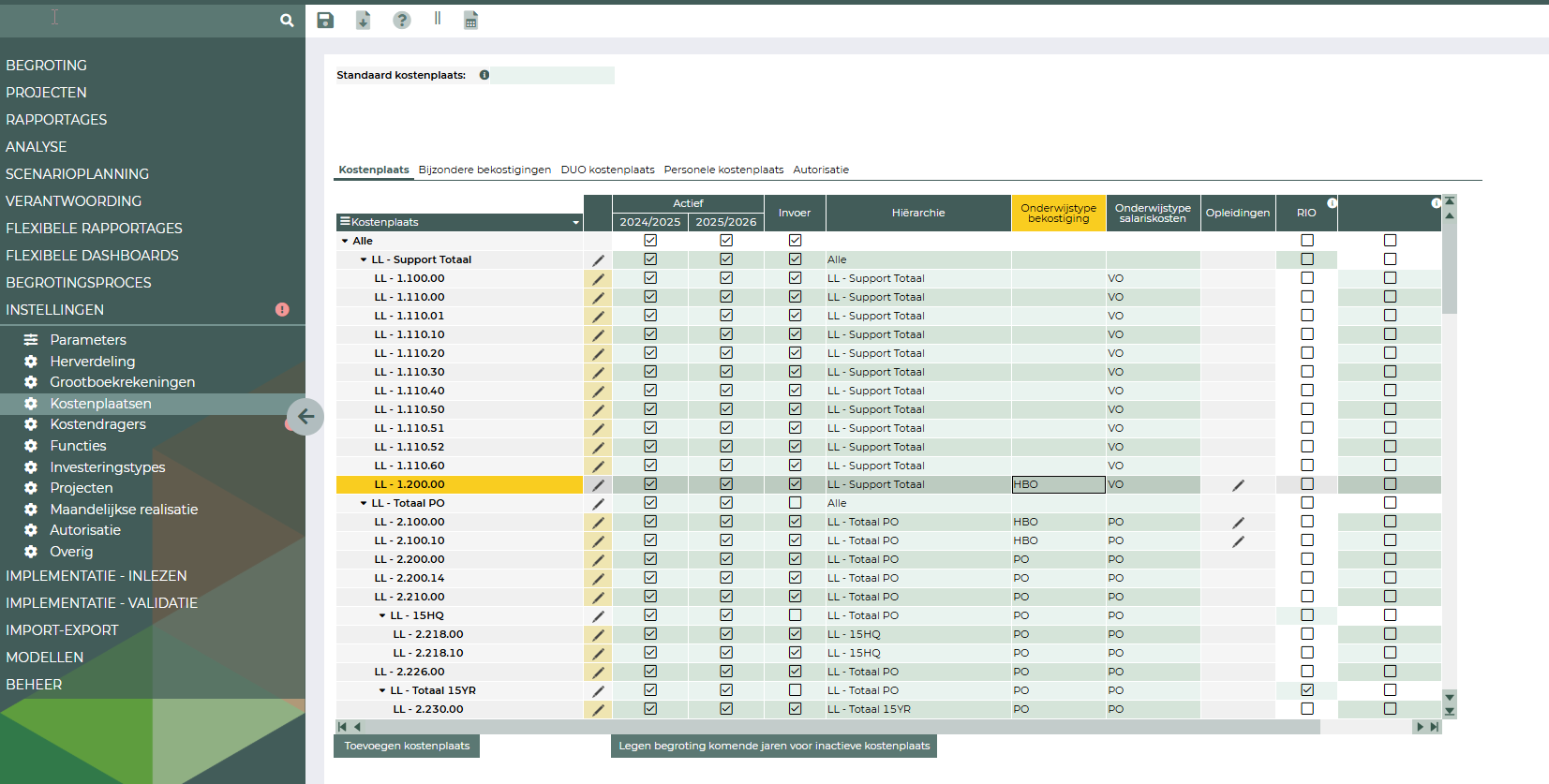 In dit tabblad kun je per kostenplaats aangeven of een bepaalde bekostigingsregeling van toepassing is, middels het zetten van een vinkje. Door middel van de kolom 'Actief' kan een bekostigingsregel worden geactiveerd.