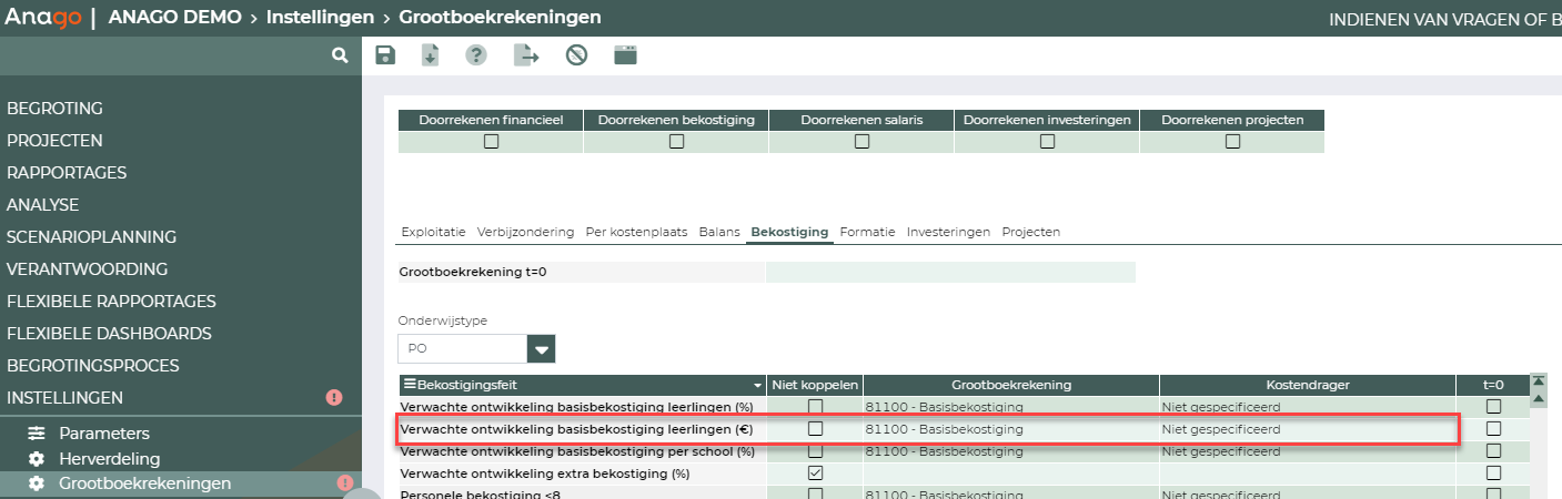 - Controleer vervolgens dat de berekening doorgezet wordt naar de gewenste grootboekrekening. Doe dit via het scherm Grootboekrekeningen, tabblad Bekostiging: