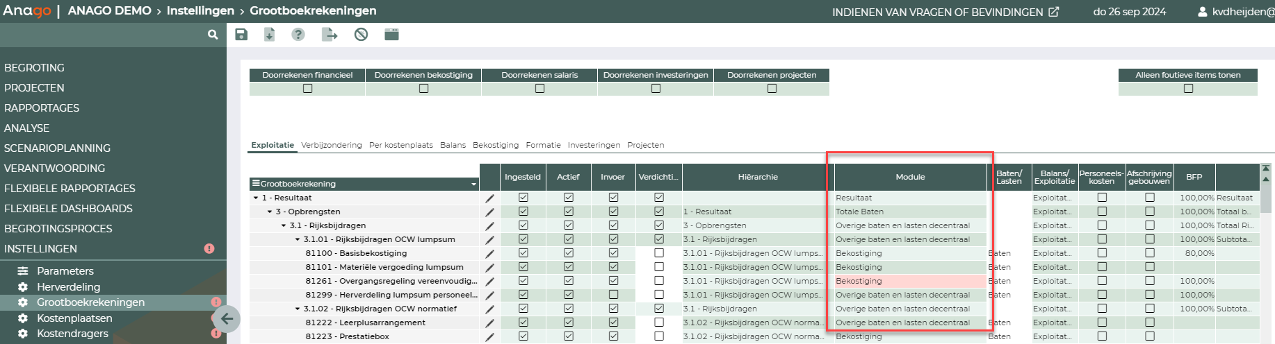 - Indien de gewenste grootboekrekening niet te selecteren is, ga je naar het tabblad Exploitatie en koppel je de grootboekrekening aan de module Bekostiging: