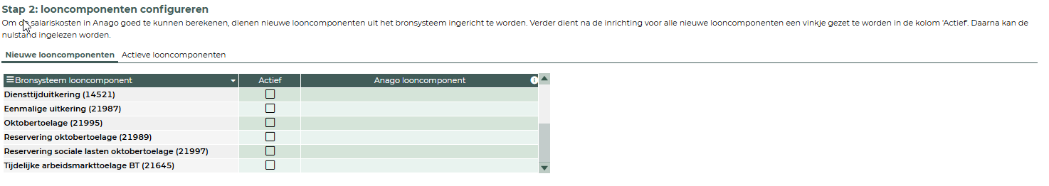 Bij het inlezen van een (nieuwe) nulstand is de tweede stap looncomponenten actief maken en indien dit van toepassing is te koppelen aan een salariscomponent van Anago in de kolom Anago looncomponent. Deze looncomponenten worden ingelezen vanuit het loonjournaal.