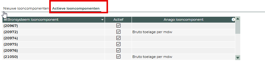 In het eerste tabje (zie afbeelding hierboven) staan alle looncomponenten die nog niet actief staan en gekoppeld staan. In het tweede tabje staan alle looncomponenten die actief zijn en in de kolom Anago looncomponent zie je of het looncomponent gekoppeld is aan een salariscomponent van Anago.