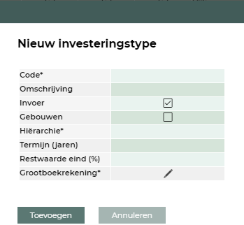 - Koppeling grootboekrekening (zie Grootboekrekeningen - Per investeringstype)