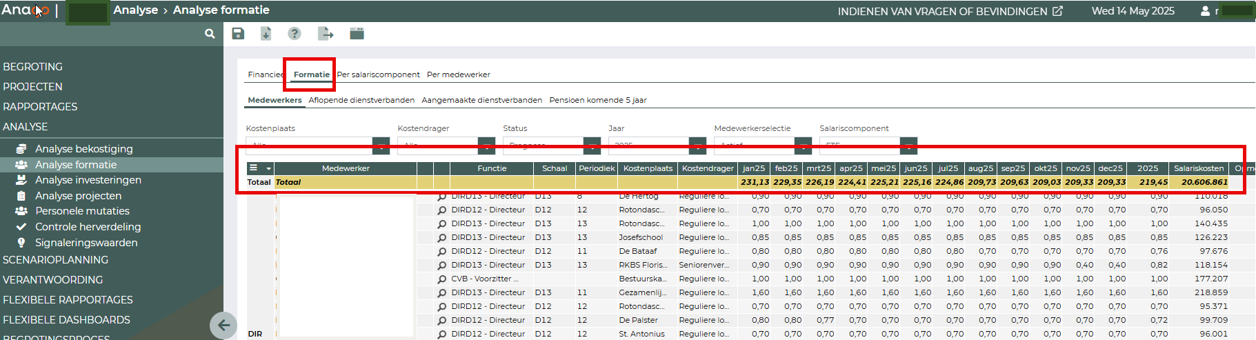 Het scherm geeft de mogelijkheid om de ingevoerde dienstverbanden de geselecteerde medewerker te bekijken. Zoals in bovenstaande afbeelding te zien is, heeft een dienstverband een begin/einddatum, een aantal FTE, een FTE DI waarde en een kostendrager en kostenplaats. Als u gebruik maakt van formatieverdeling kunt u verder inzoomen door op de cel met de drie puntjes en twee streepjes te klikken. De formatieverdeling van de betreffende medewerker zal dan getoond worden.
